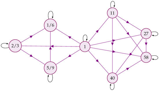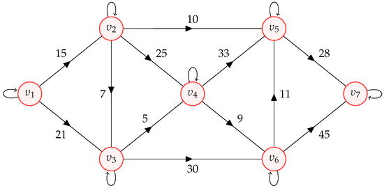 Figure 5 illustrates the weighted graph for where the weight of edge is given by , Figure 6 displays the FPs of , and Figure 7 justifies the inequality (23) under various cases of and function β (a detailed explanation can be found in the Appendix A at the end of this paper).