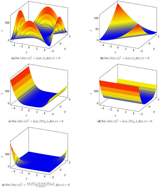 It is worth mentioning here that each of the above-mentioned cases further divides into three subcases, each corresponding to different values of the function already defined in Example 12. Thus, considering all the cases and their subcases under the contraction condition, we have a total of 18 inequalities, all of which are verified through computer simulations in Figure 7. For clarity, we included in this paper only those 3D graphs that exhibit distinct shapes, as some of them have similar representations.