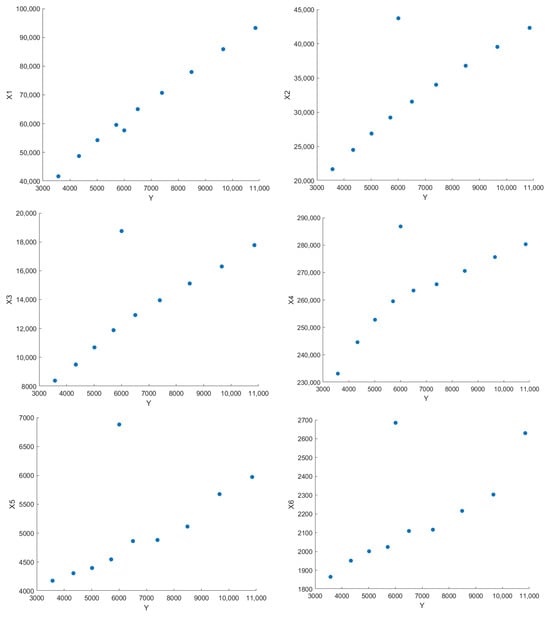 According to the relevant tourism data in Table 1, a scatter plot of the sample data in Figure 1 was plotted. The horizontal axis represents tourism revenue, while the vertical axes represent domestic tourist numbers, per capita disposable income of urban residents, per capita disposable income of rural residents, road length, railway length, and the number of travel agencies, respectively.