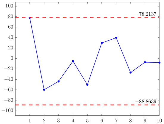 As shown in Figure 2, we can see that none of Thus, . Therefore, we think the estimated disturbance term and the fitted linear regression model (20) are appropriate.