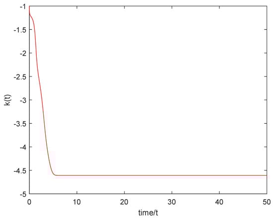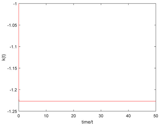 Select the following initial conditions: , , , and . Figure 4 shows that the controlled nominal system (1) is asymptotically stable with respect to the origin. Figure 5 shows that the dynamic feedback gain asymptotically tends to a suitable constant. Figure 6 shows that the disturbance estimator asymptotically tends to the disturbance .