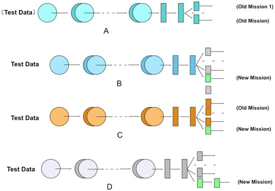 Figure 2A indicates that for the original multitask learning model, the test data are tested once on each old task. The fine-tuning method [15] initializes the parameters of the new model to those of the old one, and when training the new model, it fine-tunes some of the parameters. This commonly utilized method is intermediate; it represents the phase between feature extraction and joint training. Figure 2B indicates that when a new task appears, the gray legend represents the fine-tuned part of the parameters contained on the old model, and the yellow legend represents the fine-tuned new model. The joint training method [16] is depicted in Figure 2C. Whenever a new task appears, the aforementioned method feeds all the data from the old task and the new task into the model for retraining, which also represents the centralized training concept. This is apparently the most effective method; however, it is temporally and spatially expensive.The feature extraction method [17] can bridge the old and new tasks by extracting some of the features on the trained model of the old task and applying them to the new task for training. Figure 2D indicates that when there is a new task, the white legend represents the unchanged old model, and the yellow one represents the new model with some features applied to the old model.