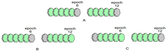 For , for each , and for , the algorithm randomly selects an integer in the interval of length f; thus, it replaces the original communication-generating wheel and adds it to . After each addition of the randomly selected communication-generating wheel to set , the algorithm computes the difference between the value of the last element in set that is not 0 and the value of its predecessor element, and it adds the computed difference to . Let the value of the predecessor element pertaining to the first element in be 0. By restricting the selection of the alternative communication-generating wheels to the left side of the replaced original communication-generating wheel (i.e., the -th wheel) to a left-open–right-closed position of length f, the interval between the two alternative communication-generating wheels (i.e., the variable communication interval) is made to be no more than and no less than 1; thus, a constraint is added to the variable communication interval to prevent it from varying considerably and from occasioning the degradation of the model performance. As per Figure 4, let the fixed communication interval be 6. Figure 4A depicts the communication generation wheels of rounds 6 and 12 when the fixed communication interval is utilized, Figure 4B indicates the minimum interval case when the variable communication interval is utilized, and Figure 4C indicates the maximum interval case when the variable communication interval is utilized.