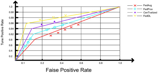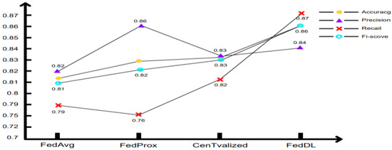 Figure 7 indicates that the FL-DL neural network model potentially exhibits higher prediction accuracy, and it can be observed that with regard to the recall rate index, the FL-DL model is apparently effective; whether all default events can be accurately detected is a crucial index that directly relates to the amount of money lost in the credit business. It can be observed that the accuracy rate of the FL-DL model is slightly lower than that of the FedProx model; however, for the overall index F1-score, the enhanced FL-DL model is somewhat superior to other enhanced traditional methods.