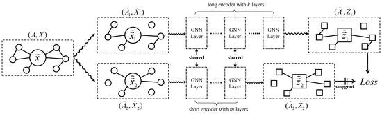 where is the neighbor set of , , and are component functions with learnable parameters. For the short GNN encoder with m layers in AGC, its parameters of all m layers are shared by the first m layers of the long GNN encoder.