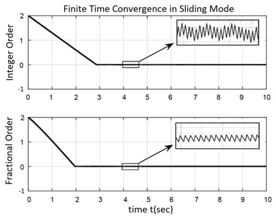 Referring to (15), the error equation within the sliding mode of FFOASMC (s(t) = 0) is , which is similar to the integer-order counterpart, . Considering k = 0.7, α = 0.01 and β = 0.99, Figure 3 illustrates the error equation on the sliding surface for integer and fractional-order cases. Notably, the chattering layer in the fractional-order switching manifold is narrower compared to the integer-order counterpart. This underscores a key advantage of fractional-order SMC over integer-order systems.