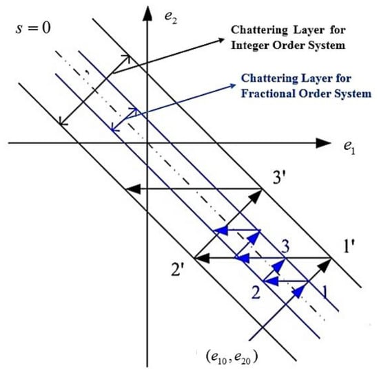 The references [,,] demonstrate that this distinction arises due to the fact that in a stable fractional-order system, system states converge to zero as t−α, whereas in a classical integer-order counterpart, this convergence is asymptotic and follows e-kt. The rate of convergence of these functions to zero favors the reduction in chattering when employing fractional-order sliding surfaces. To explain further, the general form of the error equation in Fractional-Order Sliding Mode Control (FOSMC) is denoted as , while for Integer-Order Sliding Mode Control (SMC), it is represented as . As per the solutions derived from linear fractional-order systems, as expounded in [], the error of the fractional-order system demonstrates a decay to zero characterized by , whereas the error in the integer-order scenario converges toward zero with a decay pattern akin to . This discrepancy implies that when initiated from an initial state error, the chattering layer of the fractional-order non-linear system encircling the switching manifold is perceptibly smaller in comparison to its integer-order counterpart. This serves as one of the discernible advantages of fractional-order sliding mode control over classical integer-order systems.