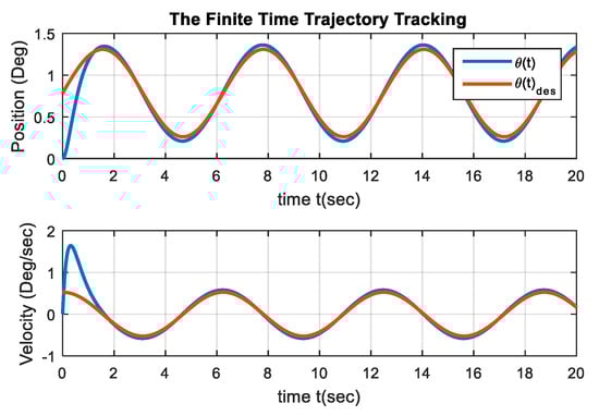 This section presents numerical examples to demonstrate the efficacy of the proposed controllers. The dynamic parameters of the KJO model are set according to []. The simulations are conducted using MATLAB/Simulink software. As the example, the FFOASMC in Equations (17) and (18) is simulated. To do this, the desired trajectory is considered as []: