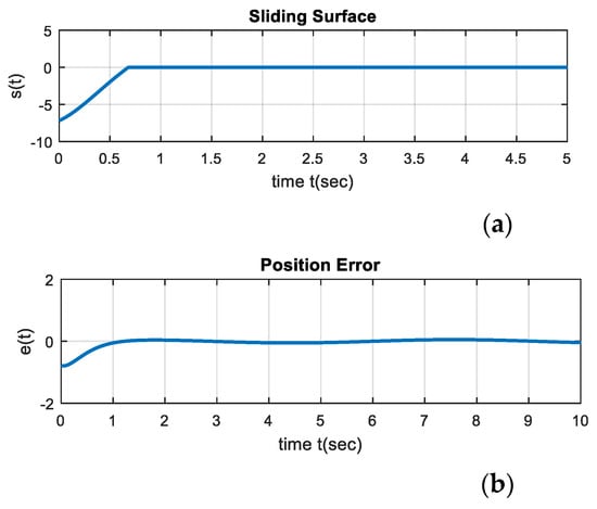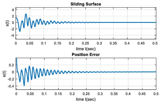 Hence, with the application of Lemma 1 and through a straightforward comparison between Equations (3) and (36), which are, respectively, and , it can be easily concluded that the Lyapunov function and as a result the sliding surface s(t) (see Equation (29)) will converge to zero with the following settling time: