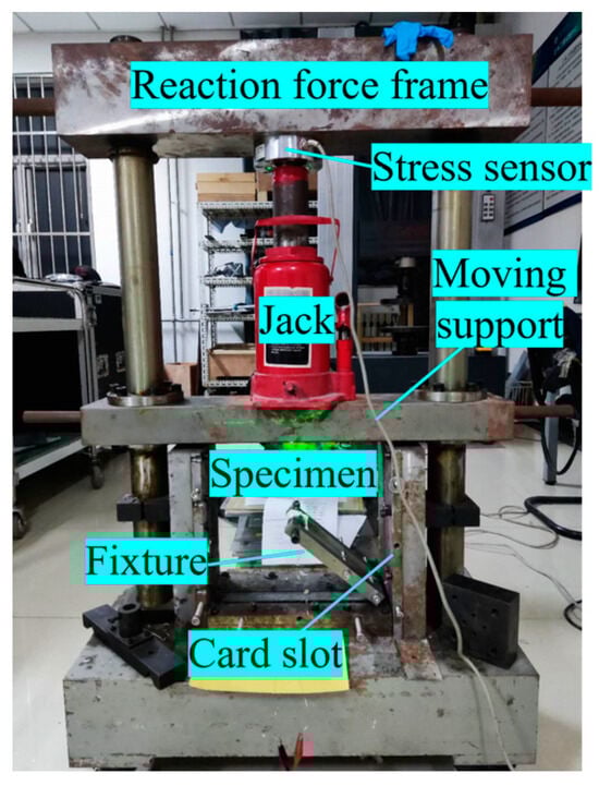 The loading system. The system includes a reaction force frame, a stress sensor, a jack, a moving support, a card slot, and a fixture.
