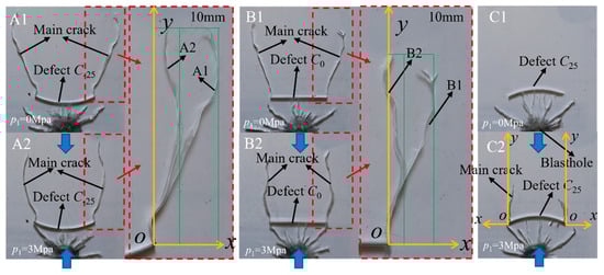 In Figure 1, the specimen is 315 mm × 285 mm × 6 mm in size, with a central round hole and a line defect. The defect and a round hole were prefabricated by laser cutting. The radius of the central round hole is 2 mm and is used as a blasthole. The length of the prefabricated defect is 50 mm. The primary goal of this research is to explore the crack propagation behavior of the defect tip, so the distance between the defect tip and the blasthole is the same, which is 40 mm. Three groups of specimens (group A, group B, and group C) were designed with defect curvature as variables. The defect curvatures in the three groups of specimens are −25 m−1, 0 m−1, and 25 m−1, and were named C-25, C0, and C25, respectively. Preloaded compressive stress (p1 = 0 Mpa or 3 Mpa) was applied on the lower and upper sides of the specimen. The experimental scheme is shown in Table 2.