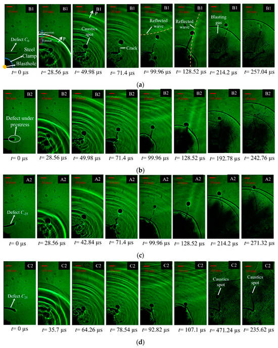 Caustics picture in blasting. (a) Specimen B1 (C0, p1 = 0 Mpa); (b) specimen B2 (C0, p1 = 3 Mpa); (c) specimen A2 (C-25, p1 = 3 Mpa); (d) specimen C2 (C25, p1 = 3 Mpa).