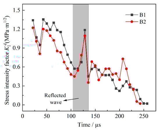 As shown in Figure 6, the curve of the DSIF in group B with time was drawn. The DSIFs of the two specimens decreased at first and then increased at the crack initiation stage. Then, the DSIFs decreased continuously with the continuous propagation of the crack. Between 100 μs and 128 μs, the crack met the first reflected stress wave, so the DSIFs increased sharply and then decreased. The two curves are relatively close, indicating that the preloaded stress has little influence on the DSIFs. The comparison of the curves in specimens B1 and B2 shows that the DSIFs in specimen B1 are larger than those in specimen B2 before the reflected waves (including the initiation stage). However, the DSIFs in specimen B2 are larger than those in specimen B1 in the later stage. The results suggest that the preloaded compressive stress can reduce the DSIFs in the early stage and promote the DSIFs with blast-induced stress wave attenuation. The propagation of the crack is towards the compressive stress direction. This phenomenon explains why the crack propagation is longer or shorter under preloaded stress. The influence of preloaded stress on the crack propagation depends on the crack direction. The angle between preloaded stress and crack propagation determines the ratio of inhibition or promotion, and affects the final crack length. Although the preloaded stress is parallel to the crack propagation direction, the DSIFs in specimen B2 are less than those in specimen B1 in the early stage (50–100 μs). From this phenomenon, it can be inferred that the DSIFs at crack initiation has a significant impact on the DSIFs in propagation due to the inertia effect, and the preloaded stress also has a lag effect on the blast-induced fracture.