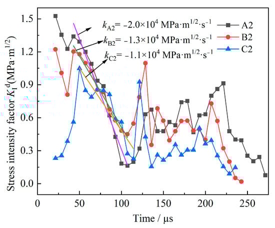 To study the effect of curvature on the DSIFs under preloaded stress, the curve of the DSIFs in specimens A2, B2, and C2 with time was drawn, as shown in Figure 7. The figure shows that the changing trend of DSIFs at the crack tip in each specimen is similar to that in group B. Except during the action of reflected waves, the DSIFs in each specimen from large to small are specimen A2, specimen B2, and specimen C2, indicating that the curvature of the defect significantly affects the DSIFs of the crack tip. According to the experimental results, it can be inferred that the DSIFs in the specimen with a negative curvature defect are larger than those in the specimen with a positive curvature defect. Because the main crack propagation length is different when it encounters the reflected wave in the specimen with different curvature defect, the DSIFs is also different. The slope of the DSIFs curve is defined as the crack tip loading rate [39]. In the attenuation stage, after crack initiation, the crack tip loading rates in specimens A2, B2, and C2 are −2.0 × 104 MPa·m1/2·s−1, −1.3 × 104 MPa·m1/2·s−1, and −1.1 × 104 MPa·m1/2·s−1, respectively. The findings indicate that the curvature of the defect affects the attenuation rate of the DSIFs. The attenuation rates from large to small are specimen A2 (C-25), specimen B2 (C0), and specimen C2 (C25).