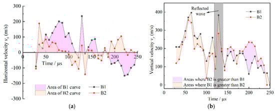 Figure 8 shows that the horizontal velocity vx and vertical velocity vy change with time in group B. The horizontal velocity vx affects the crack offset. In the two specimens, the horizontal velocity vx oscillates up and down along the zero axis. The curves of the two specimens are similar in the early stage, but different in the later stage. This is because the crack propagation direction is mainly controlled by stress waves, but the preloaded stress also affects the crack propagation, and the proportion becomes larger and larger with time. In the initial stage, the cracks in specimens B1 and B2 propagated along the negative x axis. At 28.56 μs, the horizontal velocities of the two specimens reached the extreme values of 89.9 m·s−1 and −105.3 m·s−1, respectively. The crack continued to propagate along the x positive axis, and the vx in specimen B2 reached the maximum more quickly than that of specimen B1. As can be seen from Figure 8a, when vx is greater than 0, the area of the B1 curve is larger than that of specimen B2. This explains why the main crack in specimen B1 is more offset than that in specimen B2, as can be observed in Figure 4. Meanwhile, comparing the maximum peak velocity and curve area of specimen B1, the maximum peak velocity and curve area of specimen B2 are smaller, indicating that the preloaded compressive stress significantly suppresses the crack velocity in horizontal direction, and the pattern of the main crack in Figure 4 is further explained.