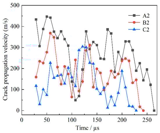Figure 9 shows the curve of the crack velocity in specimens A2, B2, and C2 with time. The initial velocities in the three groups of specimens were 432.6 m·s−1, 159.1 m·s−1, and 117.5 m·s−1, respectively. In Figure 9, the crack velocity oscillated with time, and the velocity oscillation trend was similar in all three specimens. Finally, the blast-induced cracks in specimens stopped at 264.2 μs, 242.8 µs, and 228.5 μs, respectively, indicating that the defect curvature can significantly affect the crack arrest time. The main crack propagation time at negative curvature defects is longer than that at positive curvature defects. From the overall data curve, the specimens with the main crack velocity arranged from large to small are A2, B2, and C2, indicating that the defect curvature can significantly affect the main crack velocity, and the negative curvature defect is more beneficial to the main crack propagation than the positive curvature defect. The crack velocity and time affect the crack length. The results also verify the difference of crack length among specimens A2, B2, and C2.