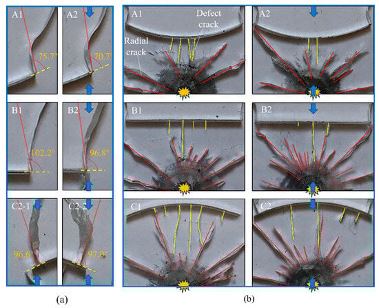 The main crack occurred at the end of the defect under blast-induced stress wave. As shown in Figure 10a, the angle between the end of the defect and the main crack was defined as the main crack initiation angle. In Figure 10a, the main crack at the right end of the defect in groups A and B was analyzed. There was no main crack in specimen C1, so the main crack at both ends of the defect was shown in specimen C2. The initiation angles of cracks C2-1 and C2-2 were about the same, which verified the repeatability of the experiment and the accuracy of the initiation angle. In the specimens with negative curvature defects, the initiation angle in specimen A1 (75.7°) was larger than that in specimen A2 (70.7°). In the defect with zero curvature, the initiation angle in specimen B1 (102.2°) was larger than that in specimen B2 (96.8°). The findings demonstrate that the preloaded stress reduces the initiation angle of the crack for specimens with negative or zero curvature defects. The compressive stress has less influence on the initiation angle, but the curvature has a great influence on the initiation angle. The initiation angle with negative curvature is smaller than that with zero curvature. For group C (the curvature is positive), the compressive stress promoted the occurrence of cracks in the defects, and the crack initiation position was not at the end of the defect. This is an interesting phenomenon, and it is further explained in the numerical analysis.