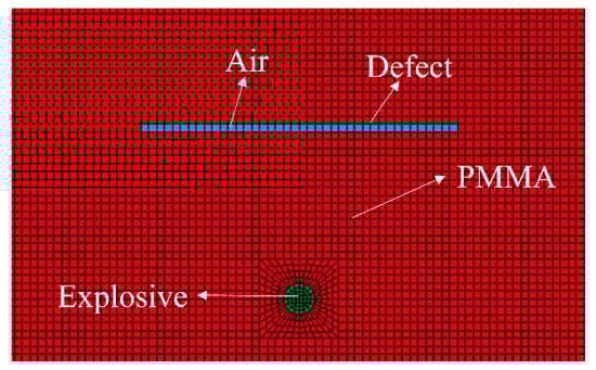 In this section, the propagation process of blast-induced stress waves at different curvature defects under compressive stress was further studied. The commercial software ANSYS/LS-DYNA (R 18.0) was used to simulate detonation and stress wave propagation. The dimensions, material parameters, and boundary conditions of the numerical model are the same as those of the above experimental specimens. According to the curvature and boundary conditions of each model, the models were named as C-25-0Mpa, C0-0Mpa, C25-0Mpa, C-25-3Mpa, C0-3Mpa, and C25-3Mpa. The accuracy of the numerical simulation method and parameters had been verified by blasting experiments [3,41]. The model utilized a single-layer solid grid with a mesh size of 1 mm. The local grids at the defects and blastholes of group B model specimens are shown in Figure 12. The Lagrangian–Euler fluid–solid coupling algorithm was used for specimens, explosives, and air. The grid nodes of explosive and air are shared, and the specimen and air are coupled with each other. For the model under preloaded static stress, the static analysis was carried out first, and then the display dynamic calculation. In Table 1, the material properties of PMMA were displayed. The elastic–plastic model was used in the specimen without considering the damage. The density of air is 1.29 × 10−3 g/cm3. The lead azide was selected for the explosive, and the JWL equation of state (Equation (4)) is used to simulate the detonation pressure P [42].