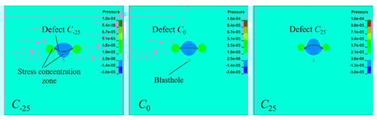 Figure 13 showed the compressive stress distribution of the specimens with defects under the pressure of 3 Mpa, that is, the compressive stress diagram at t = 0 μs. Tensile stress has a negative value while compressive stress has a positive value. Under the action of uniaxial pressure, the compressive stress concentration zone was produced at the end of the defect, and the tension concentration zone was produced in the middle of the defect and on the lower and upper sides of the blastholes. The curvature of defects affected the shape and size of the stress concentration zone, and further affected the crack initiation and propagation. The preloaded stress changed the stress state around the blasthole and further changed the crack initiation and radial crack distribution of the blasthole.