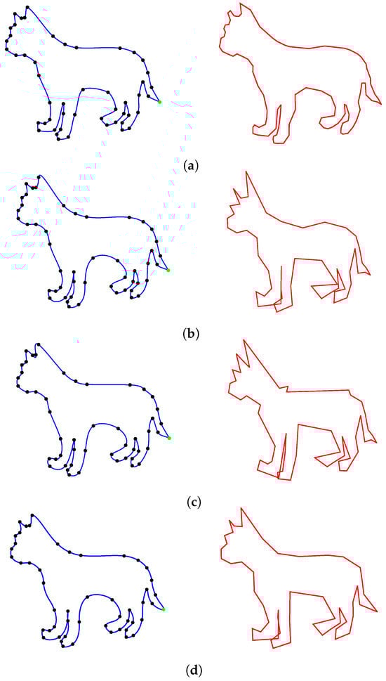 (Planar case). The number of interpolation points for this planar shape of the hand is 52. The energy-minimizing interpolation B-spline curve with corresponding interpolation points by our method is shown in Figure 1a (left). The control polygon is shown in Figure 1a (right). Three curves obtained by the traditional method and the κ-curve are shown in Figure 1b–d as comparisons. The approximated stretch energy of our method is approximated and found to be reduced by approximately 19% compared to the method shown in Figure 1c. It was also found to be similar to the methods shown in Figure 1b,d. Our results demonstrate improvement, particularly in the intricate details of the dog graphic at its joints.