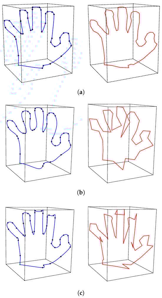 (Space example). The number of interpolation points for this space shape of the hand is 43. Figure 2a (left) is the energy-minimizing interpolation B-spline curve with corresponding interpolation points by our method. The control polygon is shown in Figure 2a (right). To demonstrate the effectiveness of the proposed method, two curves also obtained by the traditional method are shown in Figure 2b,c as comparisons. It is obvious that the interpolation results obtained by traditional methods are not good. In particular, the interpolation of the index and middle finger in Figure 2c changes the convexity of the graphic to concave. The approximated stretch energy of our method reduced the energy by approximately 30 percent compared to that of the method shown in Figure 2c and similar to that of the method shown in Figure 2b.