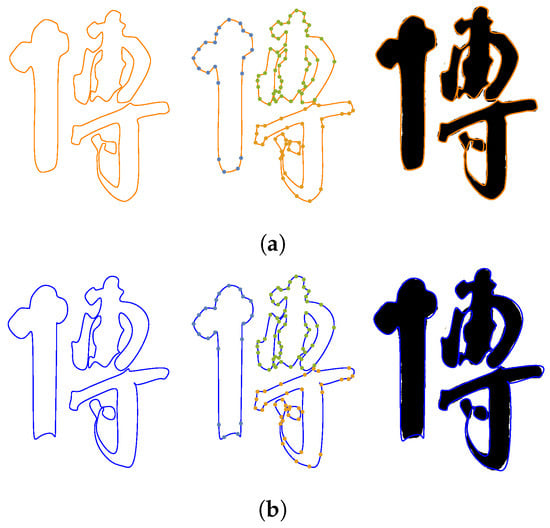 Interpolating curve construction for font modeling. (a) The energy-minimizing interpolation curve generated by our method. (b) The cubic interpolation B-spline curve generated by the classical method.