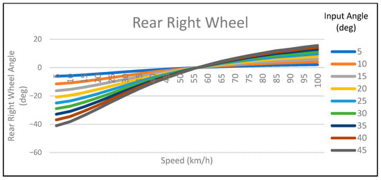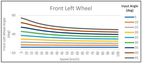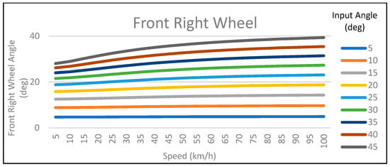 The input angle, determined by the driver of the vehicle or, in the case of autonomous driving, by the software, is regarded as the front axle’s center angle (δfront). The entrance angle ranges between −45° ≤ δfront ≤ 45° while driving normally (not while parking or doing a zero turn). In the four graphs illustrated in Figure 2, Figure 3, Figure 4 and Figure 5, the angle of each wheel, depending on the speed of the vehicle and the angle of the steering command are presented. The graphs’ calculation is based on the equations presented in reference [21] and is performed for angle values ranging from 5 to 45 degrees, with an increment of 5 degrees, and velocities ranging from 5 to 100 km/h, with 5 km/h increments.