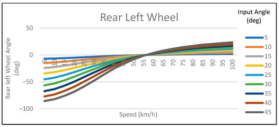 Figure 2, Figure 3, Figure 4 and Figure 5 clearly show how the angle of each wheel varies as a function of the vehicle’s input angle and its corresponding velocity. Up to a speed of 56.33 km/h, the rear wheels move in the opposite direction to the front wheels; while exceeding this threshold, all wheels have the same direction of rotation. Furthermore, it can be observed that at low speeds and with a large input angle (>30 deg), the wheels exhibit significant divergence relative to the input angle, a phenomenon that diminishes as the speed or the input angle decreases.