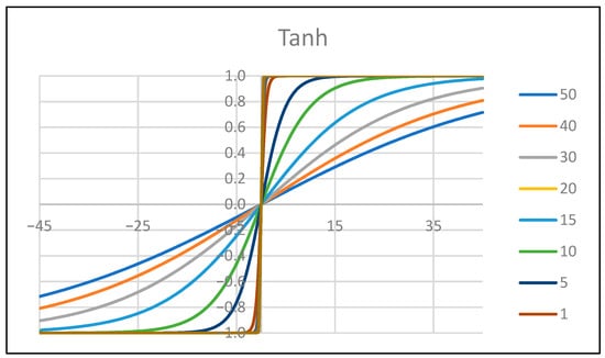 The control system presented in this paper combines techniques derived from the fields of neural networks and fuzzy logic. One important component of neural networks is the activation function, which maps the input to a non-linear output that is used to determine the activation level of the neuron. Here, after applying the trial-and-error process several times, the hyperbolic tangent function is chosen to be used as the activation function in the neural network in order to classify the error values into a range between −1 and 1. Furthermore, the slope of the hyperbolic tangent function with parameter the coefficient k is plotted, as shown in Figure 6.