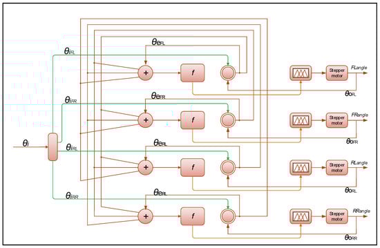 The control strategy is depicted in Figure 8 in more detail. More specifically, the vehicle steering command θi is sent to all motor controllers where the vehicle angle is converted into wheel angles (θiFL, θiFR, θiRL, θiRR) according to Section 2. The desired angle of each wheel is then compared with the output of the corresponding stepper motor (θoFL, θoFR, θoRL, θoRR) and the error (θeFL, θeFR, θeRL, θeRR) is obtained.