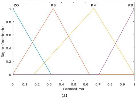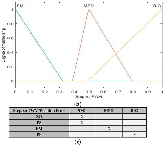 The output of MAP(ferror) then feeds the simple fuzzy logic function, where the input (PositionError) and output (StepperPWM) membership functions and rule base for the Stepper motor control are shown in Figure 9a–c. The PositionError and StepperPWM are normalized from 0 to 1.