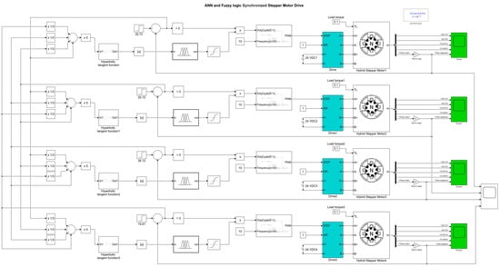 The Matlab/Simulink simulation block, presented in Figure 10, consists of four Hybrid Stepper Motors connected to their drivers, supplied by a 24 V battery, with a load applied to each one. The output angle of each motor is fed to an adder, where it is subtracted from the desired angle (step input) to calculate the error. This error is used as the input for all four neural networks, and is multiplied by 1/3 if it is not the motor being controlled, or by −1 if it is. The sum of the multiplied results is further multiplied by the coefficient k = 5 and then processed through a block, where functions (5) and (6) of Section 4 are implemented. The absolute value of the result serves as the input for the fuzzy logic controller. The saturated fuzzy logic output is multiplied by the error if it is positive, and is then used to adjust the duty cycle of the PWM block. Additionally, the frequency of the PWM block is set to 1 kHz. PWM controls the stepper motor driver, which subsequently adjusts the stepper motor to the desired angle. The step response results depicted in Figure 11 and Figure 12 provide insights into the system’s behavior under constant load conditions (0.1 Nm) on each motor. The simulation results, for the values in Table 2, allow us to confirm the accuracy with which the control method maintains the desired angles for each wheel.