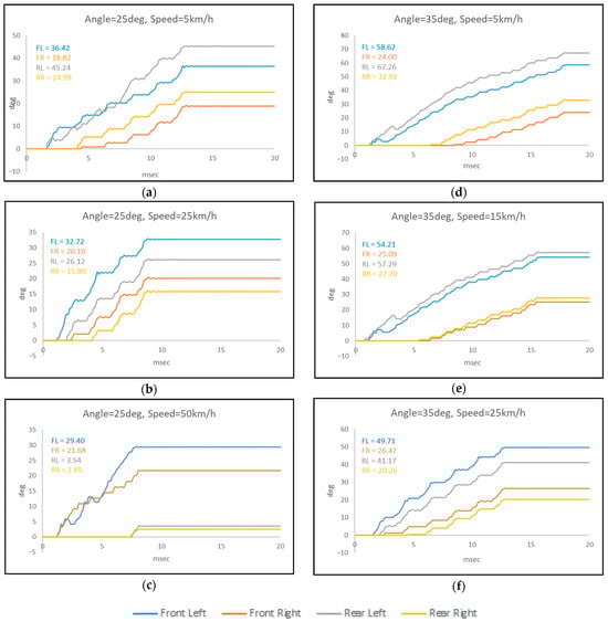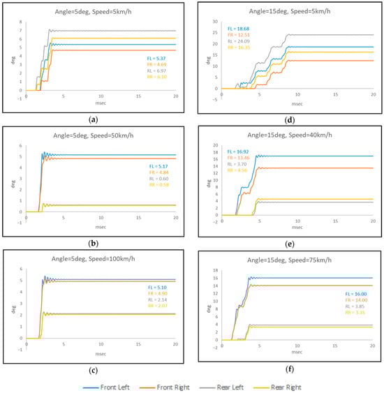 The proposed control method aims to achieve a specific angle for each wheel simultaneously, indicating a desired motion. For the purpose of this study, and in order to validate the proposed control strategy, indicative representative combinations of vehicle wheel angles and speeds are selected. The logic used to select the angle and speed combinations in Table 2 is based on the fact that the higher the speed, the smaller the steering angle the vehicle can have, and the lower the speed, the larger the steering angle can be. Taking this into consideration, input angles of 5, 15, 25, and 35 degrees in combination with speeds of 5–50–100 km/h, 5–40–75 km/h, 5–25–50 km/h, and 5–15–25 km/h are chosen, respectively. The combination of these values is summarized in the first two columns of Table 2, while the next four columns present the individual angles of the four wheels, as derived from the graphs in Section 2.