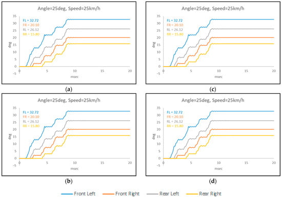 (a) Step response at 25 deg and 25 km/h—front left motor overloaded ×3 (0.3 Nm); (b) Step response at 25 deg and 25 km/h—rear left motor overloaded x3 (0.3 Nm); (c) Step response at 25 deg and 25 km/h—front right motor overloaded ×3 (0.3 Nm); (d) Step response at 25 deg and 25 km/h—rear right motor overloaded ×3 (0.3 Nm).