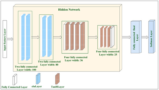 Neural network architecture: The feature vector that was extracted from the dataset images is accepted by the input feature layer. The elu activation layer comes after the previous two layers, which are each fully connected layers with a width of 100. The elu layer comes after two layers, each with a width of 80. A tanh activation layer is then followed by a group of four fully connected layers, each with a width of 36. Then, a set of four layers with a width of 25 follows, each followed by a tanh activation layer, except for the fourth-last layer. The total number of classes determines the final fully connected layer width. The classification process is then completed using a softmax layer.