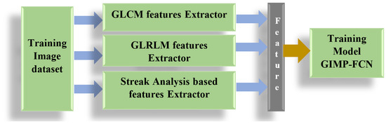 We designed the feature set for our purposes based on texture-based features. The Maximum Relevance Minimum Redundancy (MRMR) algorithm was applied to the texture features, and the 36 top-ranked features were selected. A total of 22 features that use GLCM for feature extraction were selected, as described in Section 3.1.1, with 11 GLRLM-based features selected, as described in Section 3.1.2. We also developed three streak-area analysis-based novel features, inspired by [34], as described in detail in Section 3.1.3. The final feature (f) was generated by concatenating the three sets of features extracted from the GLCM, GLRLM, and normalized streak area of the images.