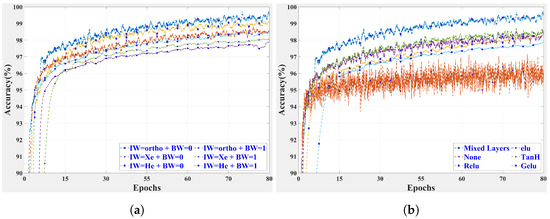 We also experimented with various combinations of activation methods, i.e., ‘ReLU’, ‘tanh’, ‘ elu’, ‘ gelu’, ‘swish’, ‘leaky ReLU’, ‘none’, as well as a mixture of activation layers placed at different positions. Every component of the input is subjected to a threshold operation when a ‘ReLU’ layer is present. This operation resets any value less than zero to zero. The tangent hyperbolic ‘tanh’ method was applied to the layer inputs by an activation layer using the ‘tanh’ function. When fed positive inputs, an ‘ elu’ activation layer carries out the identity operation, whereas when fed negative inputs, it carries out an exponential nonlinearity operation. A ‘leaky ReLU’ layer carries out a threshold operation that includes multiplication of any input value that is smaller than zero by a constant scalar. Another type of activation method is called a swish activation layer, which uses the swish function on the inputs. Gated linear units (gelus) are the component-wise product of two linear projections, one of which is passed via a sigmoid function beforehand. Activation methods are discussed in detail in [46]. Table 11 summarizes the obtained results, and Figure 5b shows the testing accuracy for different epochs for activation functions employed in between fully connected layers. We can clearly see that the mixture of activation layers in which the first four layers were followed by an ‘elu’ layer and next nine fully connected layers were followed by a ‘tanh’ layer performed better than network architectures in which only one activation function was used throughout the network structure. The use of no activation layer performed poorly as compared to the other layers. The ‘ReLU’, ‘ elu’, ‘tanh’ and ‘ gelu’ configurations produced similar results, but the mixed combination performed exceptionally well. The ‘swish’ and ‘leaky ReLU’ configurations are not reported, as their results were not satisfactory. We experimented with different mixes of layers for our network architecture and found that the best mix of activation layers was that with four ‘ elu’ and nine ‘tanh’ activation layers, as shown in Figure 1 and Table 11.