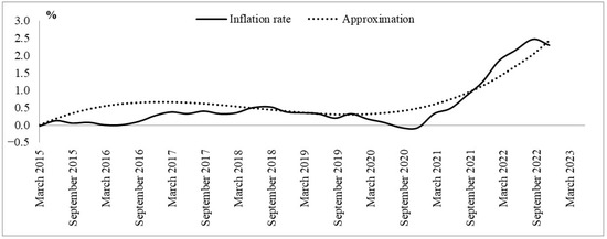 With a certain degree of conditionality, publications that are devoted to the problems of unstable economic development can be divided into two large groups. The first group of publications deals with various aspects of the relationship between inflation and economic growth. Some authors have pointed to the absence of a rigidly determined relationship between growth and inflation, when economic growth is possible both with and without inflation [10]. Other authors were more categorical, stating that inflation does not contribute to economic growth [11]. Price stability as a good condition for economic growth is postulated by a third group of researchers [12]. Some researchers are convinced that even low or moderate inflation rates have a temporary negative impact on growth rates, leading to a significant and permanent reduction in per capita income: a decrease in inflation by even one percentage point leads to an increase in per capita income by 0.5–2% [13]. Empirical evidence for cases of high inflation has led some researchers to conclude that, during crises with high inflation, economic growth falls sharply, but then quickly recovers after inflation falls [14]. Cointegration models, used to estimate inflation and GDP growth in four countries (Bangladesh, India, Pakistan, and Sri Lanka), showed a long-term positive relationship between GDP growth and inflation; namely, moderate inflation fuels growth, but faster economic growth fuels inflation [15]. A vector autoregressive analysis was used by Ito and Sato [16] to study the end-to-end impact of exchange rate changes on domestic prices in East Asian countries. In particular, it is shown that inflation did not rise sharply after the Asian currency crisis of 1997–1998 in most of the crisis-affected countries, with the exception of Indonesia, where high inflation followed a very large nominal depreciation of the rupiah. Interesting empirical facts about Hong Kong’s economy deserve attention, when its economy went from a period of high inflation in the early 1990s to a stage of high deflation after the Asian financial crisis, which led to a 65% drop in residential property prices, a reduction in income, and a severe budget deficit [17]. The use of a dynamic panel threshold model to estimate inflation values for long-term economic growth based on data for 124 countries showed that, for industrialized countries, inflation should not exceed 2%, and for non-industrialized countries, an inflation rate of 17% is associated with lower economic growth rates [18]. The use of the same model for countries with tight inflation targeting showed that inflation at 4.18% is the threshold above which it negatively affects economic growth [19]. Thus, we can state that there is a consensus on the need for inflation targeting, the threshold values of which may be different for developed and developing economies.