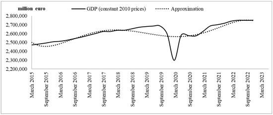 Figure 2 shows the quarterly Eurozone GDP dynamics in 2010 prices between March 2015 and March 2023 [40].