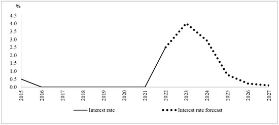 According to statistics for the period from 2015 to 2022, the average quarterly interest rate is 0.12% per annum, and in the fourth quarter of 2022, the interest rate was 2.5% per annum [40]. High inflation risks due to a significant increase in geopolitical instability are forcing the interest rate to be increased. It is reasonable to assume that, in the medium term, the monetary authorities will strive to return the interest rate to the pre-crisis level in order to normalize the economy. In this regard, let us consider a scenario of a short-term increase in the interest rate followed by its reduction to the average statistical level. This scenario is formed using the following formula:
