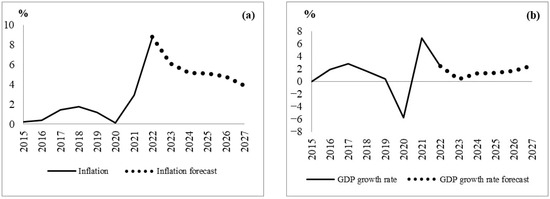 According to official statistics, for the period of 2015–2022 in the Eurozone, the average annual inflation was 2.09%, and the average annual GDP growth was 1.49% [40]. It is obvious that the sharp rise in energy prices will contribute to inflationary pressure in the coming years.