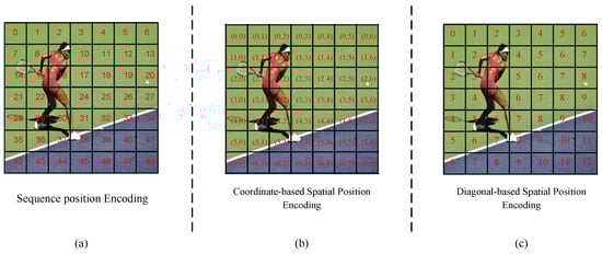 The CSPE described in the previous section effectively prevents the loss of spatial position information by encoding the position of the feature map in rows and columns separately. However, it needs to encode twice for the two axes, row and column, which increases the time complexity. In fact, it is possible to encode the feature map only once while ensuring that the 2D spatial position information is retained. In addition, we consider that the spatial location information of the visual feature has a triangular symmetry and that the column encoding can be represented, for example, using the transposition of the row encoding of the first method described above. Thus, we explore another, diagonal-based, position encoding approach. First, the original visual information of the image is extracted by the encoder and reshaped into a sequence, denoted as , , with dimensions (B, L, C). Next, we use  to represent any pixel information on the feature map, and encode the position along the diagonal direction of the feature map (the direction of ), as shown in Figure 2c. The pixel points at position  are assigned code mark 0, those at , code mark 1, those at , code mark 2, and so on. Then, we reshape the position encoding to obtain the sequence of position information, as . Next, we vectorize  based on Equation (1). Finally, the visual information sequence and the position information sequence are fused to obtain the brand new spatial visual information sequence  as: