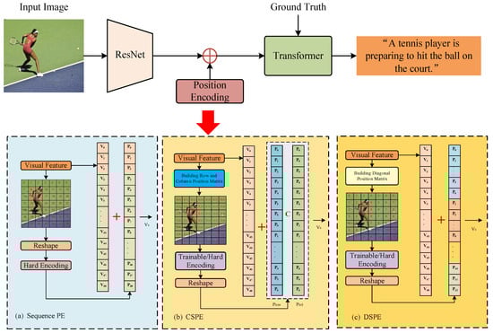 General architecture of the model and the three position encoding methods adopted in each version of the model. The image is first input into ResNet to extract features, then combined with the position encoding, and then input into Transformer for decoding to obtain the description sentences. (a) Sequence position encoding (SPE): the position labels of visual features are provided row by row, and their feature dimensions are expanded by hard coding, and finally they are added to the visual features. (b) Coordinate-based spatial position encoding (CSPE): First, 2D coordinates are provided for each visual pixel, and then the row and column position encoding are encoded separately. Finally, the row and column position encoding are concatenated and added to the visual feature. (c) Diagonal-based spatial positional encoding (DSPE): this provides location markers for visual features along the diagonal direction, then encodes them, before, finally adding them to the visual features.