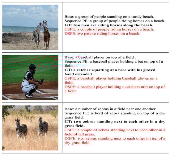 In this section, using MS COCO 2014, we employ the base model without/with SPE, CSPE, and DSPE, respectively, to obtain descriptive sentences and compare their differences, as shown in Figure 3. The descriptive sentences generated by the base model have some relevance to the image contents, but some important content is ignored. For example, in the first image, the base model fails to recognize the horse, so the “riding horses” is described as “standing”, and in the third image, it ignores the scene in the image. Compared with the base model, the model with SPE captures more visual information, and it can describe the parts that the base model cannot describe. However, it has the problem of misrepresenting some objects; for example, it describes “gloves” as “bat” in the second image. Our proposed methods produce more detailed sentences due to the spatial position information guidance. In the third image, our proposed methods focus not only on the background of the image “grass field”, but also on the number of zebras in the image, and use the corresponding descriptive terms “two zebras” or “a couple of zebras”. The descriptive sentences obtained by the model with our methods are closer to ground truth. The above analysis proves that position encoding is important for the image captioning task, and spatial-based position encoding can make a model pay more attention to details of the image and achieve more consistency with human description habits than SPE.