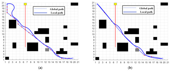 - Fox, D.; Burgard, W.; Thrun, S. The dynamic window approach to collision avoidance. IEEE Robot. Autom. Mag. 1997, 4, 23–33. [Google Scholar] [CrossRef]