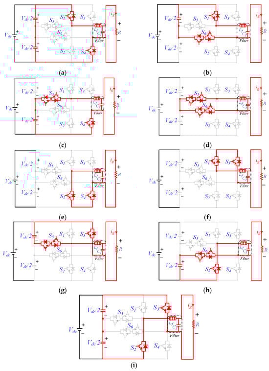 Different switching states of the topology. (a) T1; (b) T2; (c) T3; (d) T4; (e) T5; (f) T6; (g) T7; (h) T8; (i) T9.