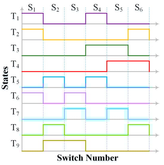 All these switching states can also be represented as waveform which is depicted in Figure 6. It is obvious from the waveform that the only two switches are in ON condition for every available state. Moreover, each switch is turned ON thrice to generate a commutative of nine states. The T-type topology is considered for this work as it is suitable for medium voltage, high-power applications with an acceptable compromise on level count, complexity, redundancy, and issues elaborated on. With the advent of ultra-wide bandgap devices, MLI topologies with a greater number of levels can be less cost-effective than MLI topologies with lower levels. However, the traditional two-level and three-level inverters offer little redundancy, thus making MLI topologies with low level counts attractive. Moreover, the T-type topology lacks any switched capacitors and consequently their associated disadvantages.