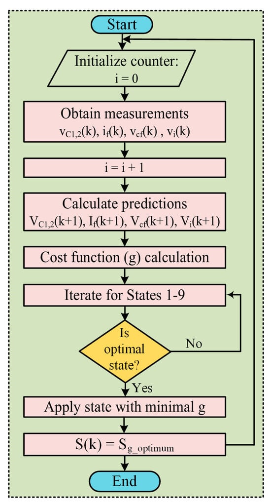 where and are the candidate states for the jth switch for the kth sampling time. The overall control flow is depicted in Figure 8.