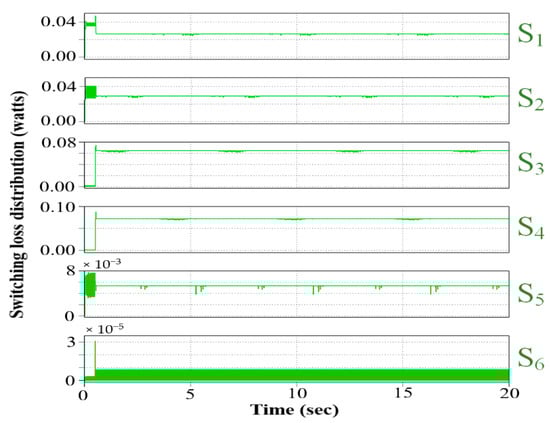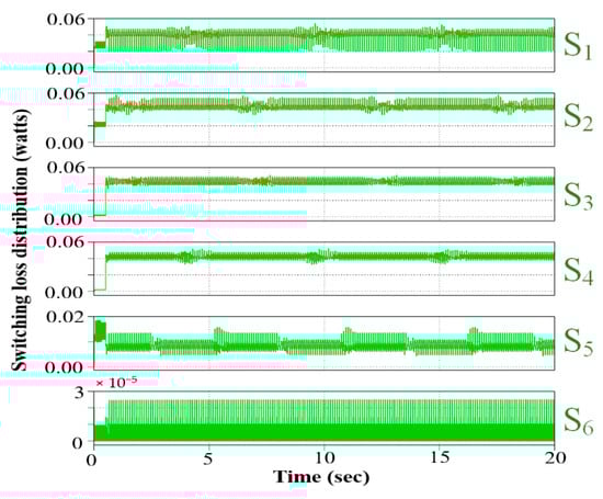 Simulations are performed to evaluate the converter loss distribution under high-power conditions without frequency penalization. MATLAB/Simulink environment has been used to perform the simulation of the system. The simulation parameters are given in Table 3. The switching loss distribution in Watts for switches S1–S6 is depicted in Figure 9. The figure indicates that S5 and S6 have substantially lower switching losses than other switches. Therefore, the frequency penalization weighing factor w is to be applied only on switches S1 through S4. Previously, several works have investigated weighing factor tuning against varied objectives. Auto-tuning and factor elimination of weighing factors have been observed in works such as [15]. Optimal weighing factor determination can be solved online or offline.