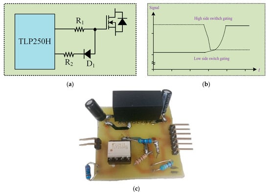 - Gate Driver Unit: Gate drivers based on the TLP250 optocoupler and isolated power supply IC (integrated circuit) are provided to drive the gate of the MOSFET used in the prototype. These drivers can amplify the 3.3 V signals provided by the controller as well as provide isolation. A special configuration with resistor R1 = 100 Ω, R2 = 5 Ω has been used to provide the hardware deadband which prevents the shoot-through of complementary MOSFET pairs. Since the MOSFET switching time decreases with increasing gate resistance, a fast-switching diode D1 (1N914) which can pass the switching signals with low propagation delay has been incorporated in the circuit as shown in Figure 14a. This configuration provides increased turn-on time and decreased turn-off time, hence preventing the overlap between the higher and lower side MOSFETs as shown in Figure 14b. The prototype of the gate driver unit used in this experiment is shown in Figure 14c. Six such gate driver units are used in the inverter and one MCWI03-48S15 isolated power ICs are employed in each unit;